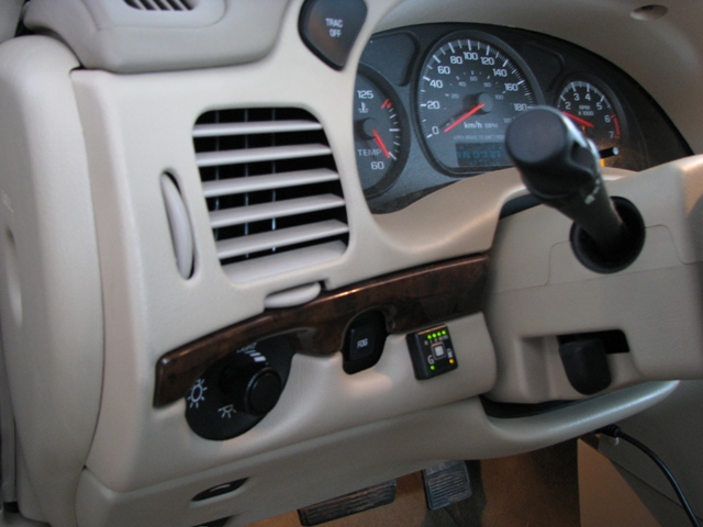 The propane system's control panel finally mounted. The panel is equipped with a very sticky adhesive so be sure it's aligned properly before you press it into position. The fuel tank level is indicated by the four green LEDs (indicating full). The orange LED indicates that the engine is running on gasoline and the green LED under the "G" (which is actually flashing) indicates that the system is waiting to switch over to propane. |