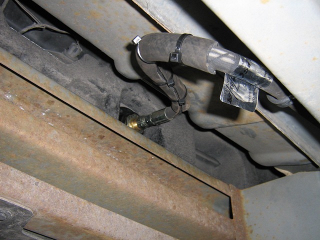 Running the propane fuel line with the other fuel lines makes for a neat installation. The cable hanging down around the engine's cross member is for the propane tank's level sensor and solenoid valve. |