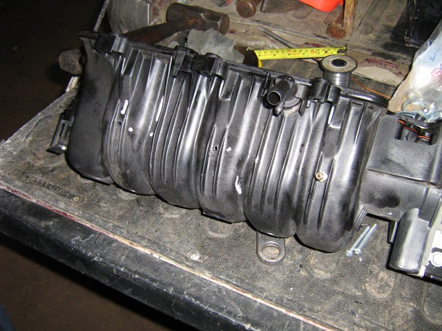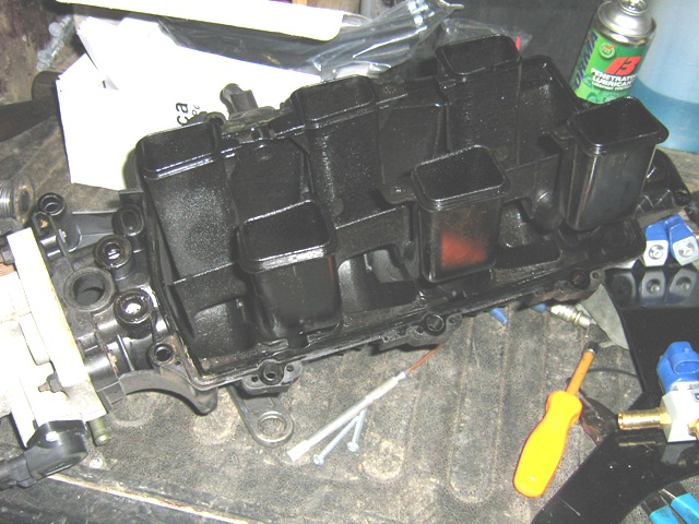 The intake manifold on a 3.8L engine contains an inner baffle that produces a tuned intake runner effect. Technocarb recommends that the injector nozzle holes are drilled with the manifold bolted down so as to ensure that the holes pass through and are aligned in both sections. We held the inner baffle securely in place while we drilled the holes. |