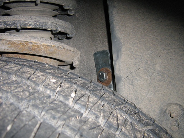 The propane tank's front bracket bolt viewed from the wheel well. |