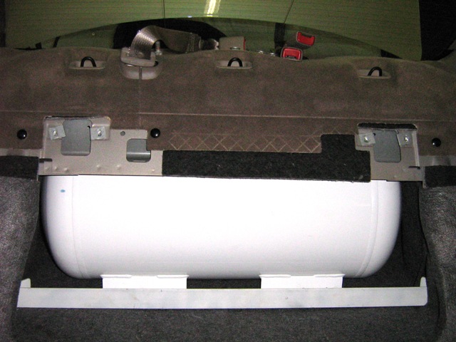 The fuel tank as mounted in the trunk. This is a 16x36 tank which holds 82 litres (21.6 US gallons) of propane. The extra capacity of this larger tank improves the chances of only having to fill up at the cheapest stations. For a more trunk room, the 14x38 tank (68 litres / 18 gallons) should be used instead. |