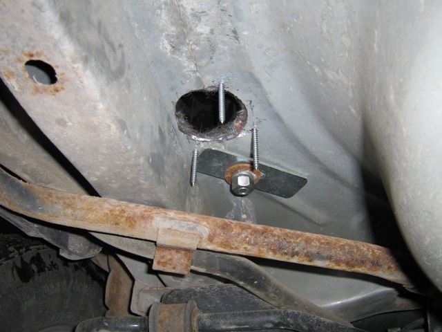 The best place to locate this hole is on the driver side. The exhaust pipe runs on the other side which would make the installation much more complicated. A very sharp hole saw is required to cut this hole because of the extra thickness of the floor beside the frame rail. The bolt in front of the hole secures the rear bracket of the propane tank. And yes, the screws were trimmed shorter. |