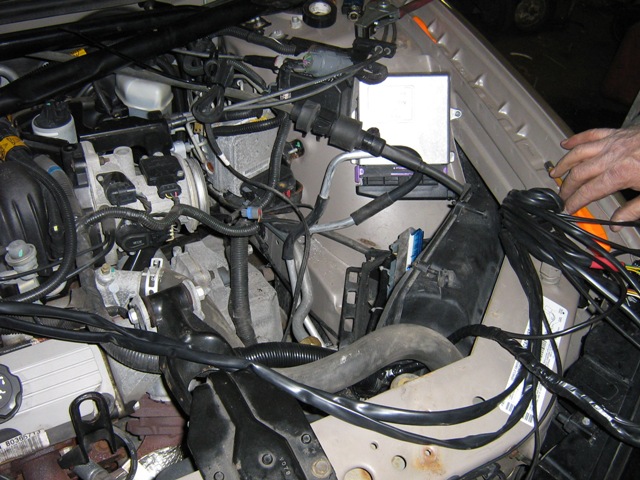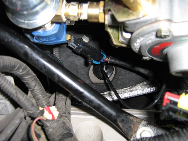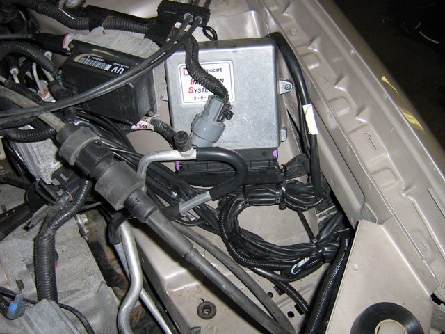 The really technically challenging part of an injection conversion is splicing the propane system's wiring into the engine's wiring harness. On universal systems, the installer has to figure out which wires to splice into. On model-specific systems, the kit manufacturer's wiring diagram specifies exactly which wires go where. On the Impala, the vehicle's computer is located in the airbox and splices were made near the PCM connectors. |